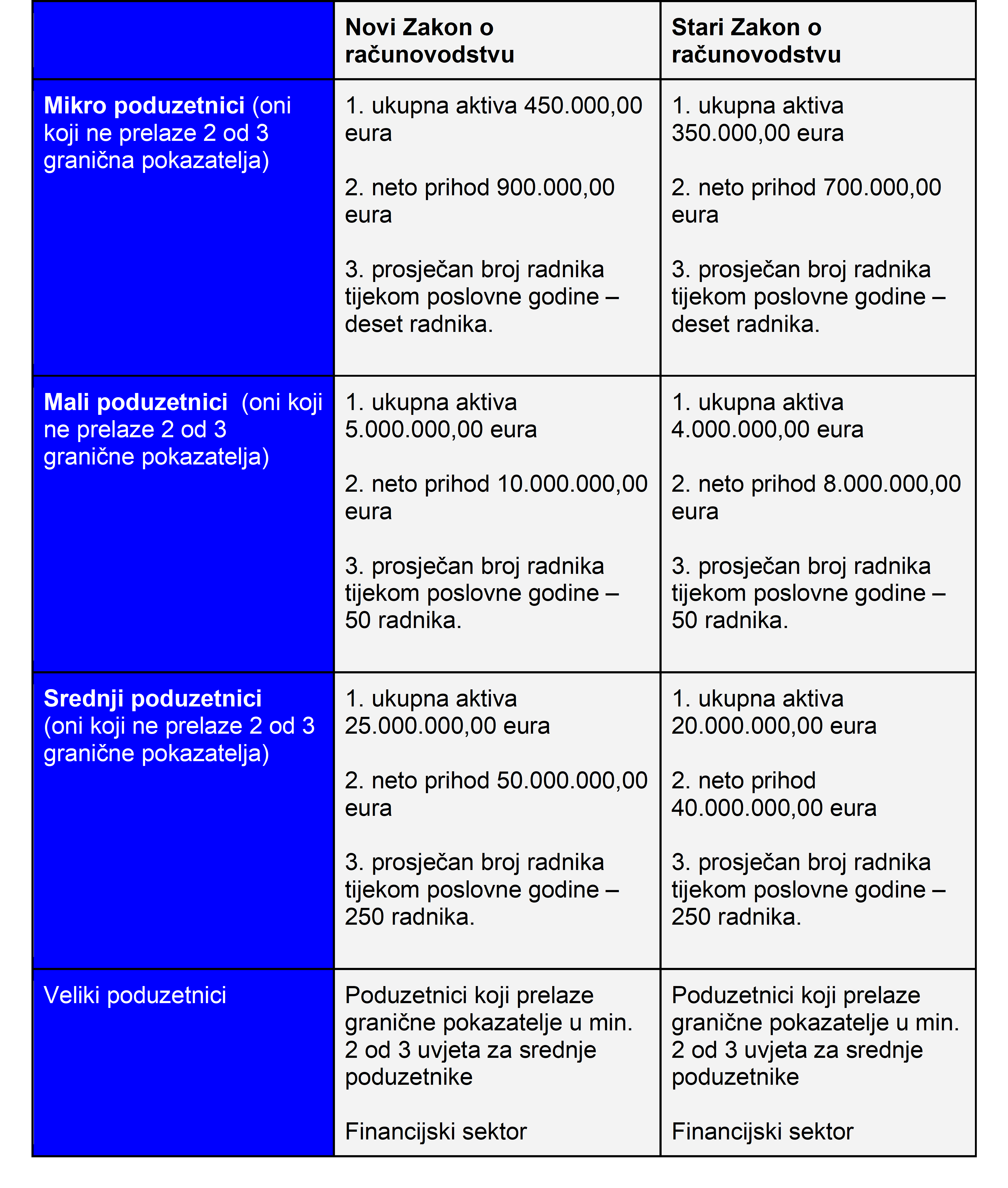 Zbog otežanog poslovanja za poduzetnike u vrijeme inflacije u 2021. i 2022., Europska komisija je predložila promjenu novčanih kriterija veličine poduzetnika, slijedom čega je u novom Zakonu o računovodstvu povećan prag za razvrstavanje poduzetnika. Novi kriteriji za razvrstavanje poduzetnika u odnosu na stari Zakon o računovodstvu:
