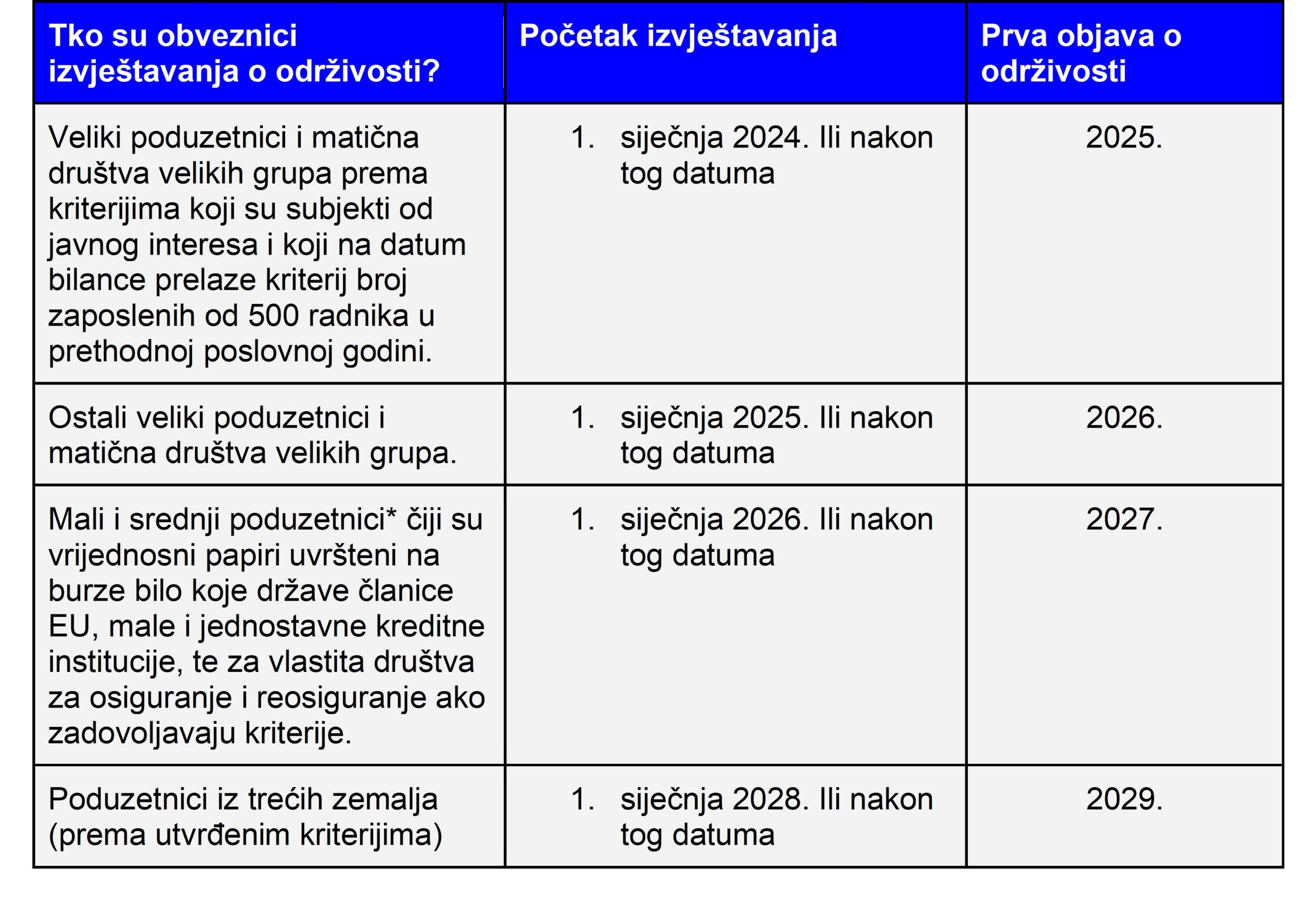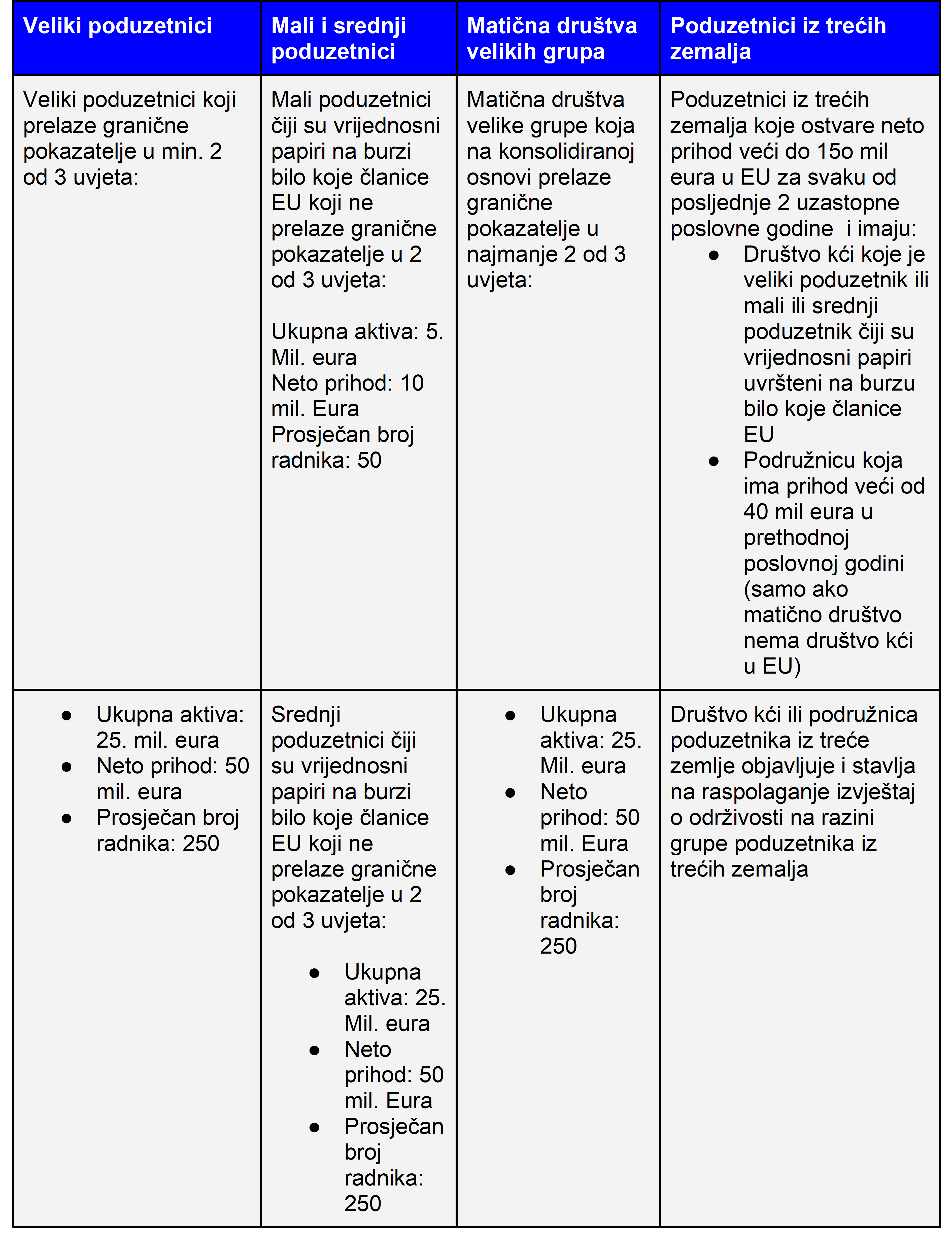 2. Izvještaji o održivosti Kako su ekologija i održivost u fokusu EU, novi Zakon obvezuje poduzetnike, prema dolje navedenim kriterijima, na izradu i objavu Izvještaja o održivosti: