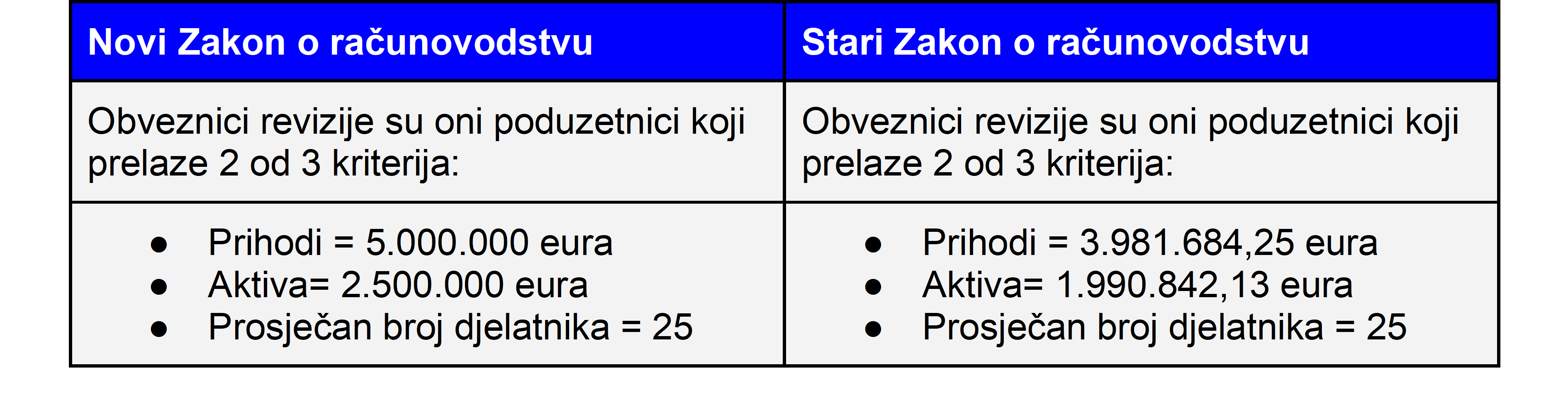 Obveznici revizije Sukladno novom razvrstavanju poduzetnika, povećani su i financijski kriteriji za obveznike revizije.